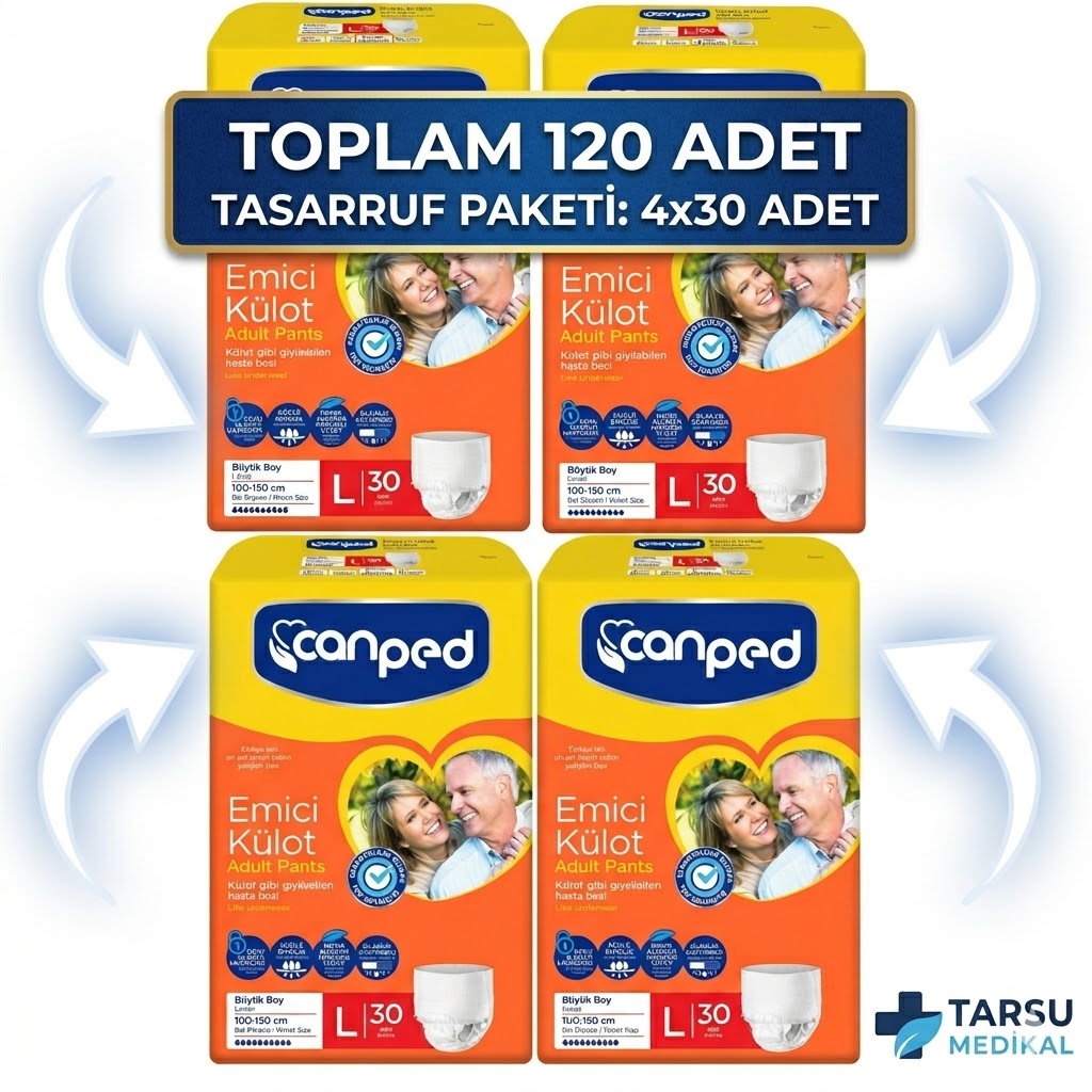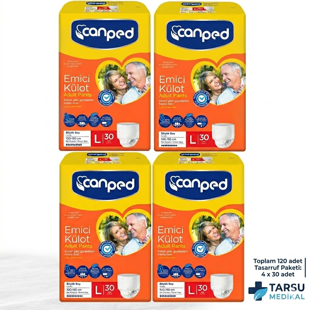 Tarsu Medikal güvencesiyle, hareket özgürlüğünden ödün vermek istemeyenler için ideal çözüm! Canped Emici Külot, normal bir iç çamaşırı gibi giyilebilen yapısıyla hem hastalar hem de hasta yakınları için hayatı kolaylaştırır. 120 adetlik (4 x 30 paket) bu özel set, uzun süreli kullanım ve ekonomik avantaj sağlar.