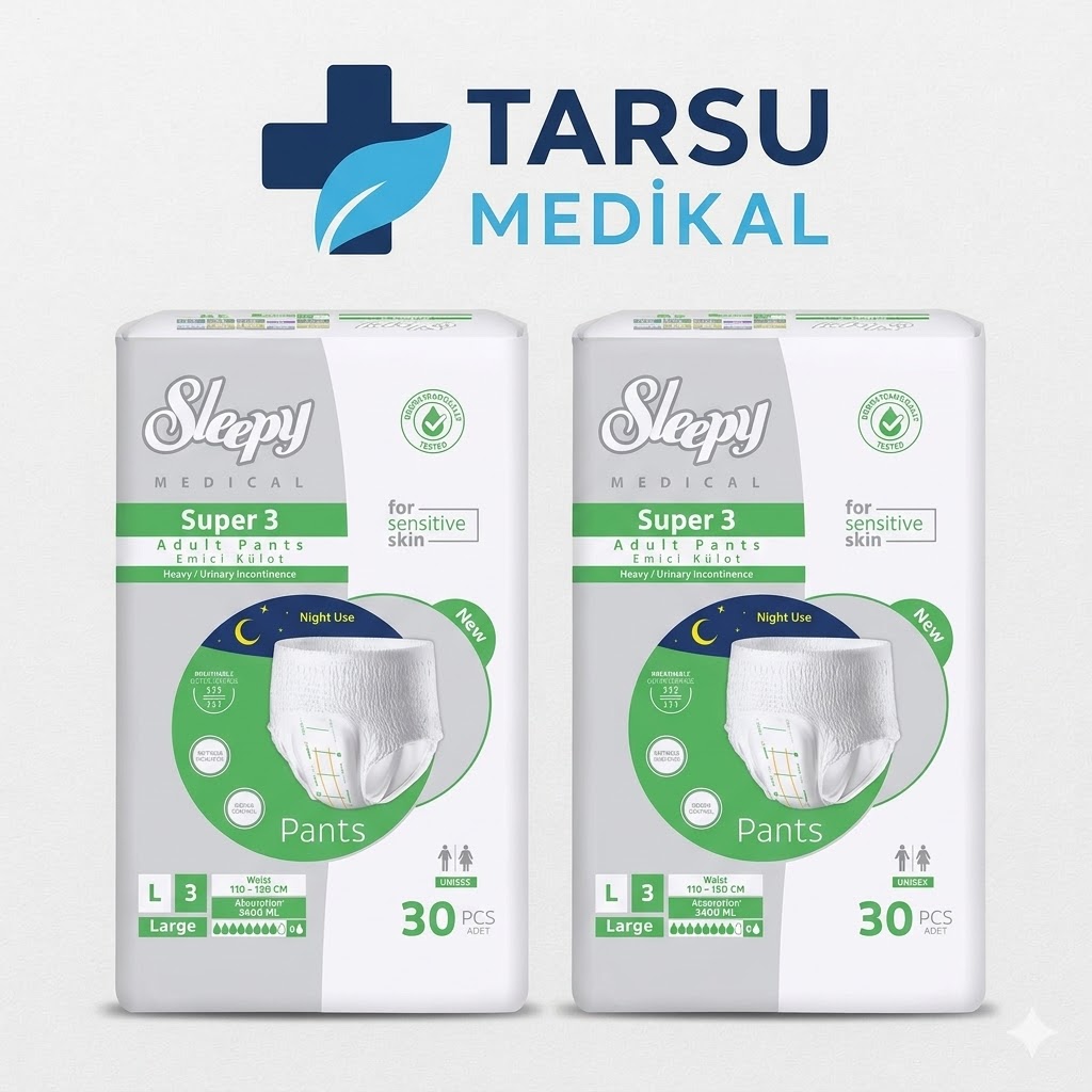 Gün boyu konfor, gece boyu güven! Sleepy Medical Super 3 Külotlu Hasta Bezi, hareket özgürlüğünden ödün vermek istemeyen kullanıcılar ve pratik bir bakım süreci arayan refakatçiler için özel olarak tasarlanmıştır. Tarsu Medikal güvencesiyle sunduğumuz bu ürün, yüksek emiş kapasitesi ve cilt dostu yapısıyla hayatı kolaylaştırır.